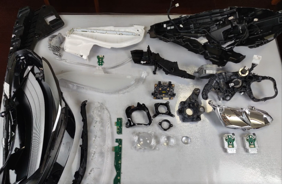 為了避免客戶車型業(yè)務(wù)沖突,我們拿在美國(guó)拆解的特斯拉車燈總成圖片給大家展示各個(gè)零件。拆解過(guò)程也比較簡(jiǎn)單,就是結(jié)構(gòu)上比較緊密:第一步先拆下大燈面罩,第二步,拆下雙色面內(nèi)罩,第三步,拆下白眉日行燈,然后拆下后壁轉(zhuǎn)向燈,取下內(nèi)壁的反光碗,就可以拿出主支架(電路板在里面)了。